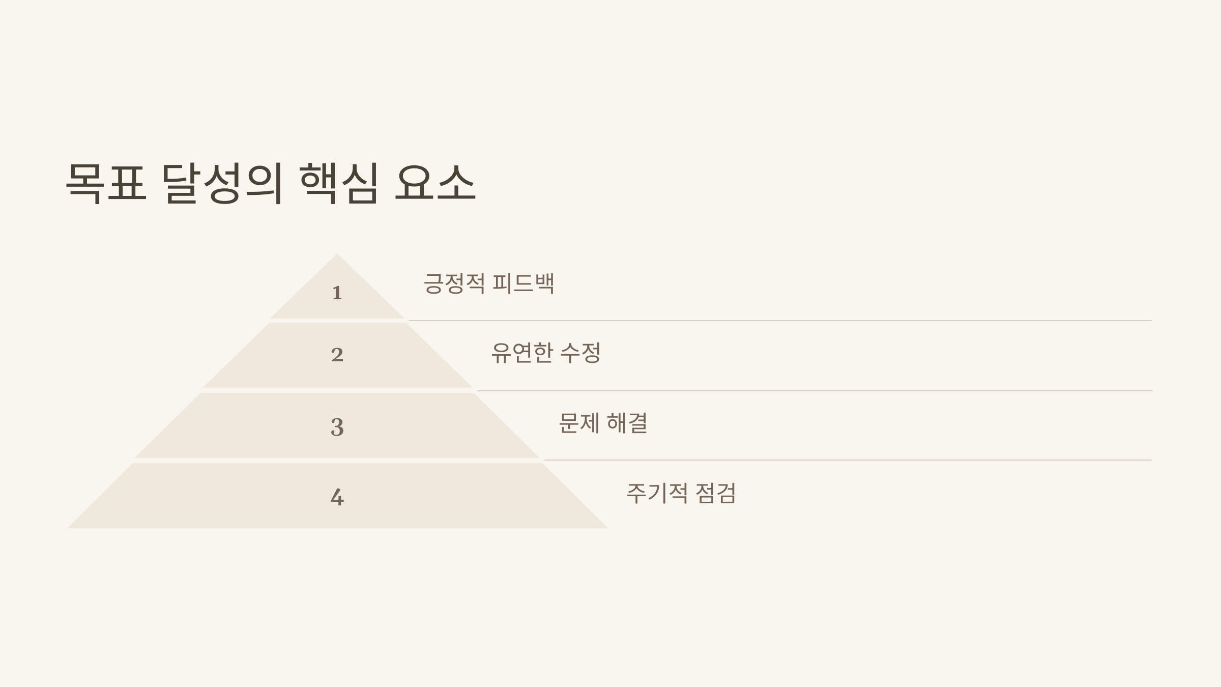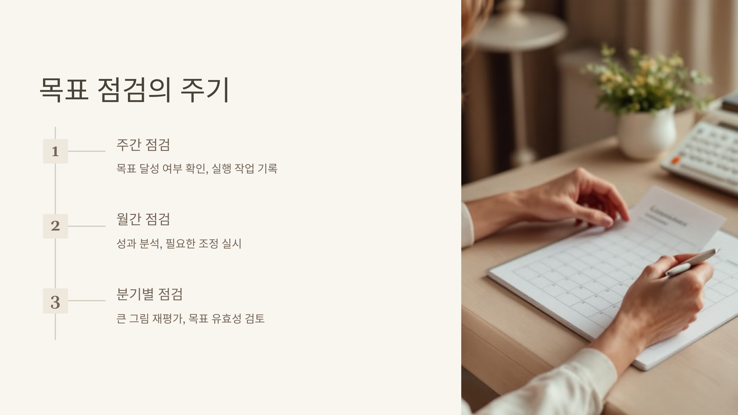 목표는 단순히 세우는 것이 아니라, 꾸준히 점검하고 개선하는 과정을 통해 달성될 수 있습니다. 주기적인 점검, 문제 해결, 유연한 수정, 그리고 긍정적인 피드백은 목표를 끝까지 유지하고 달성률을 높이는 핵심입니다. 2025년, 여러분의 목표를 성공적으로 이루어 나가세요!