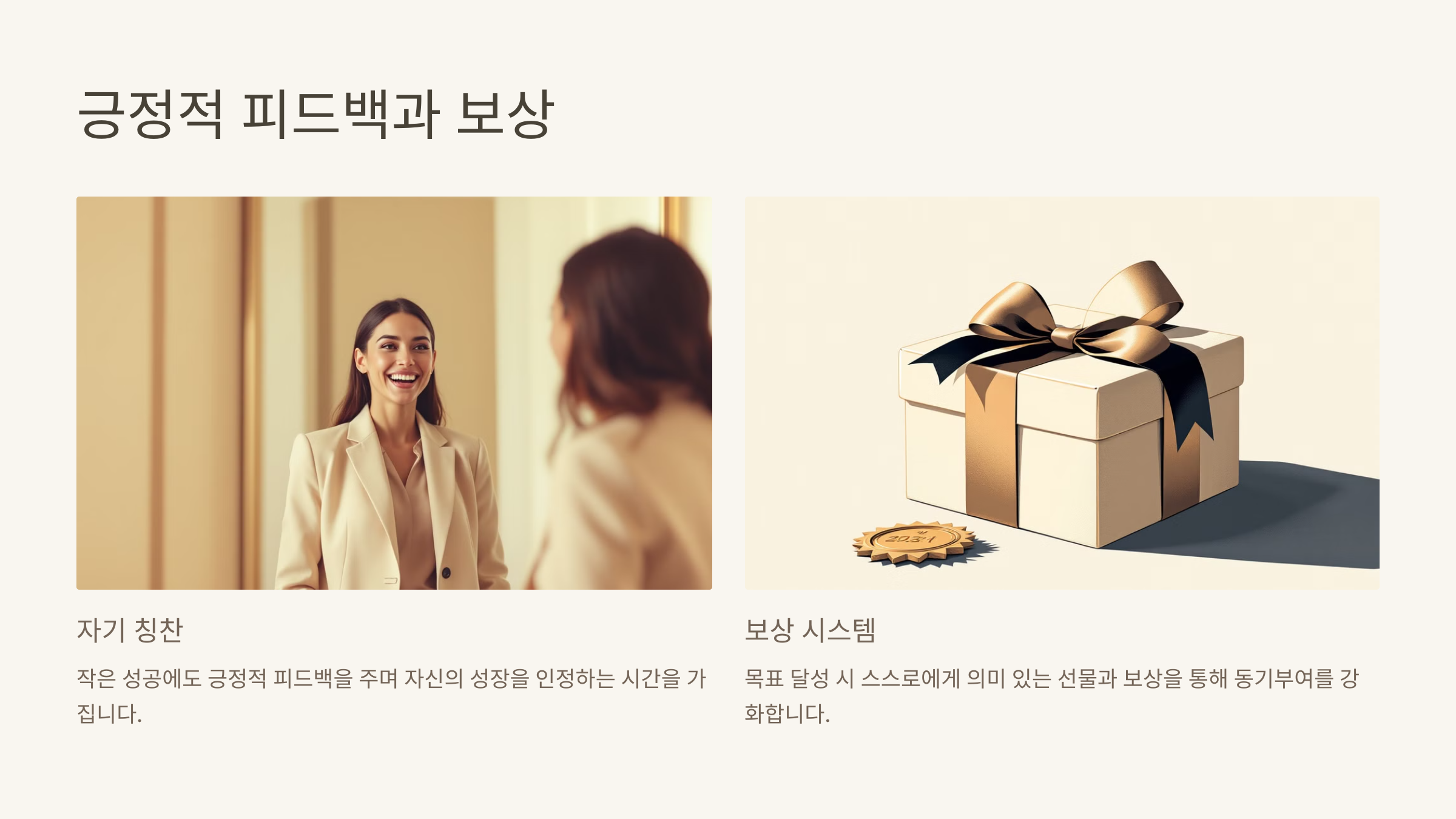 - 작은 목표를 달성했을 때 스스로를 칭찬하고, 긍정적인 피드백을 제공합니다.