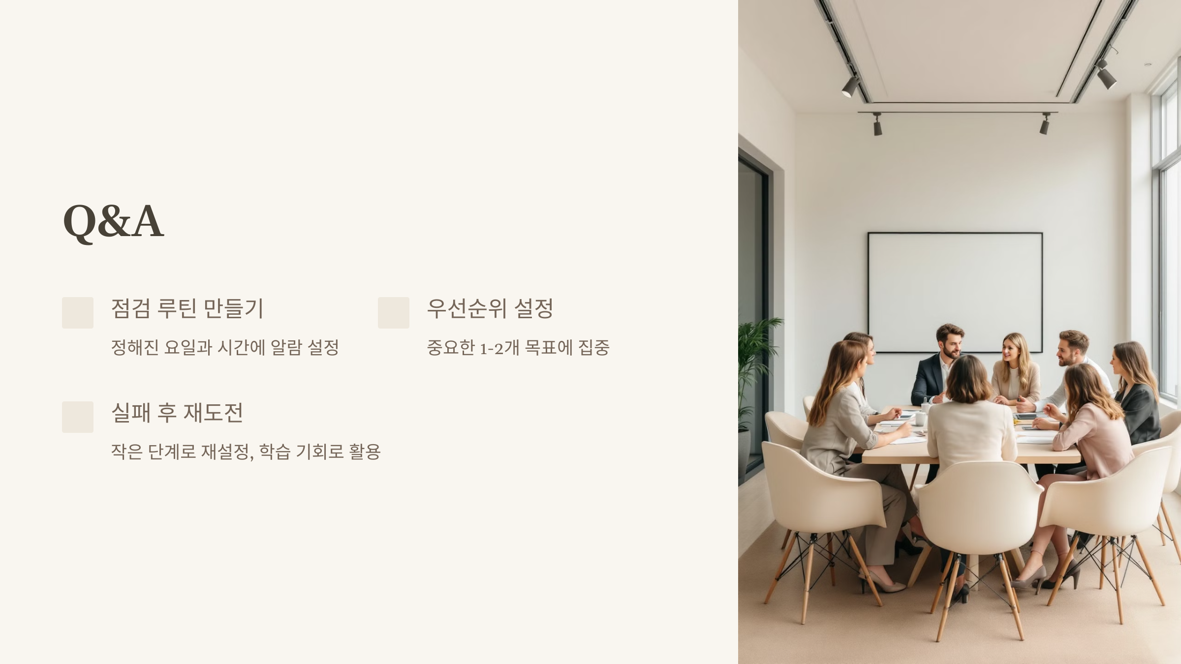 A1. 정해진 요일과 시간을 지정해 점검 루틴을 만들고, 알람이나 리마인더를 설정해 꾸준히 실천하세요.