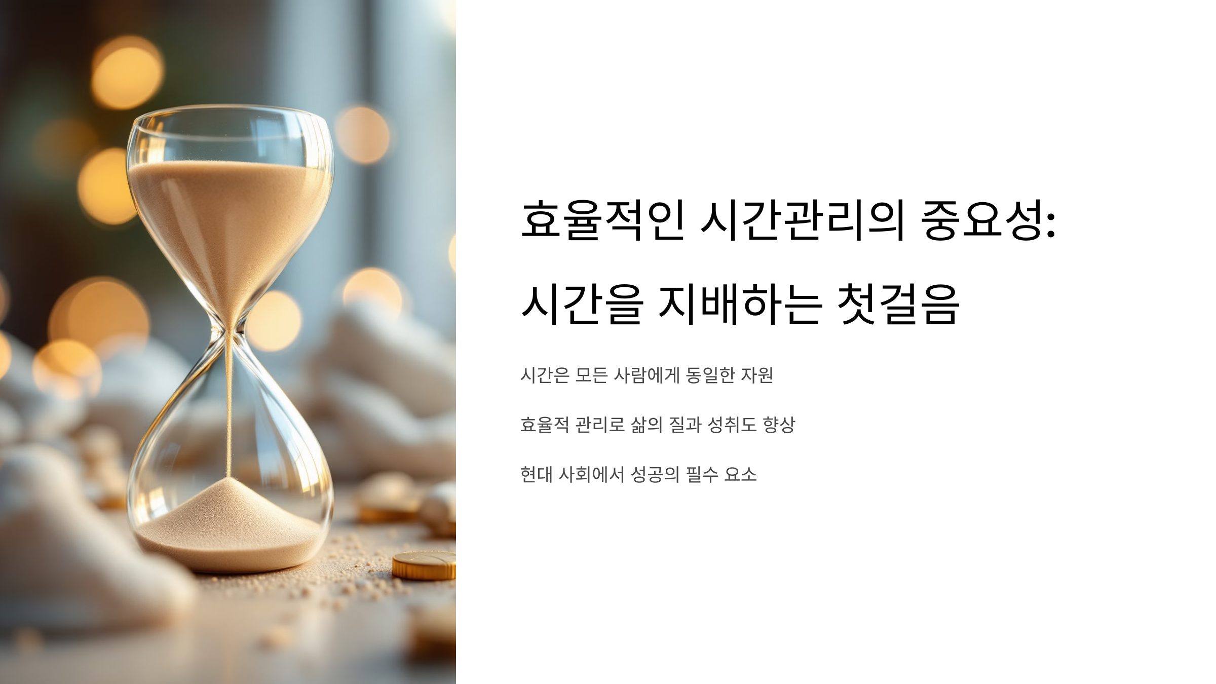 효율적인 시간관리는 단순히 더 많은 일을 하기 위한 것이 아니라, 더 가치 있는 삶을 살기 위한 필수 도구입니다. 우선순위를 정하고, 체계적인 계획과 실행을 통해 하루하루를 의미 있게 만들어 보세요. 시간을 지배하는 당신의 첫걸음은 바로 지금 시작됩니다!