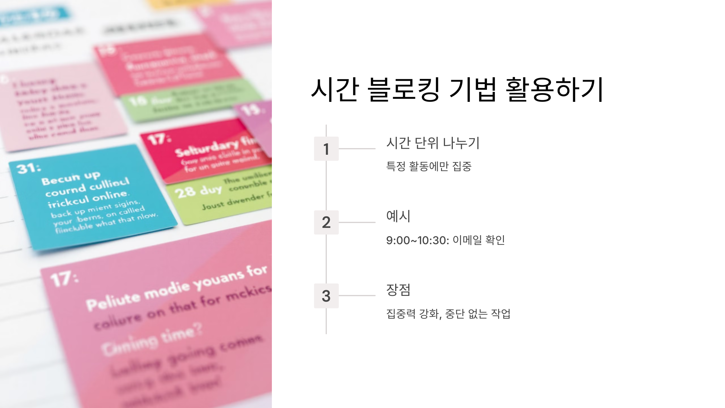- 하루를 시간 단위로 나누어 특정 활동에만 집중.