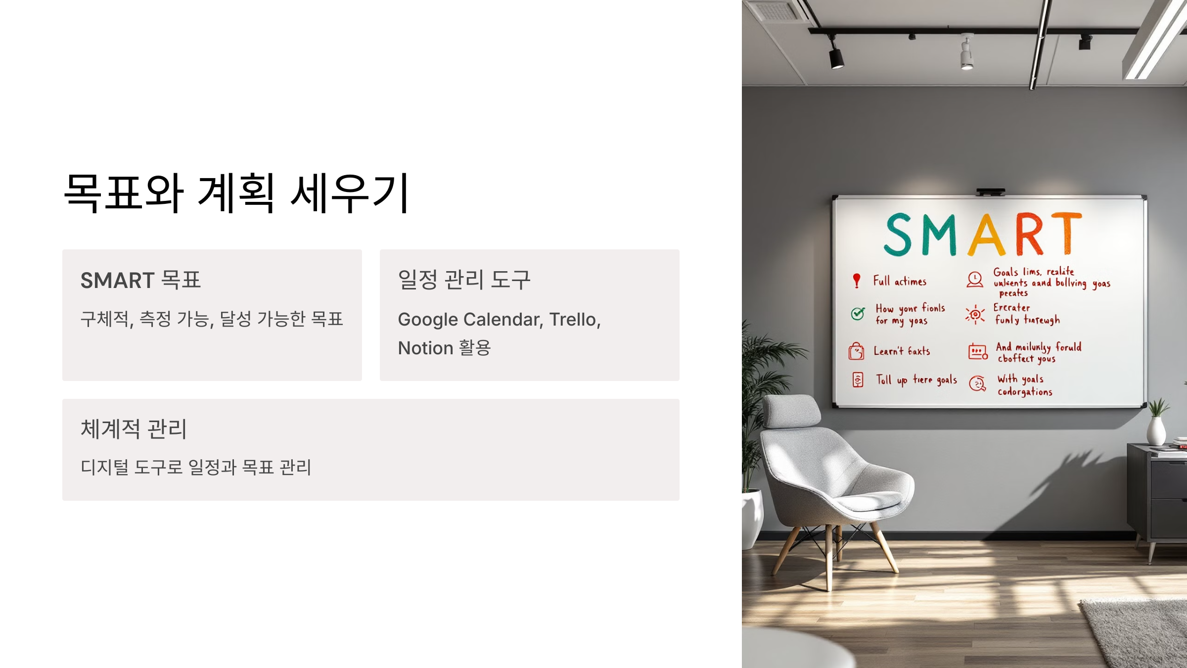 - Google Calendar, Trello, Notion 등 디지털 도구로 일정과 목표를 체계적으로 관리.