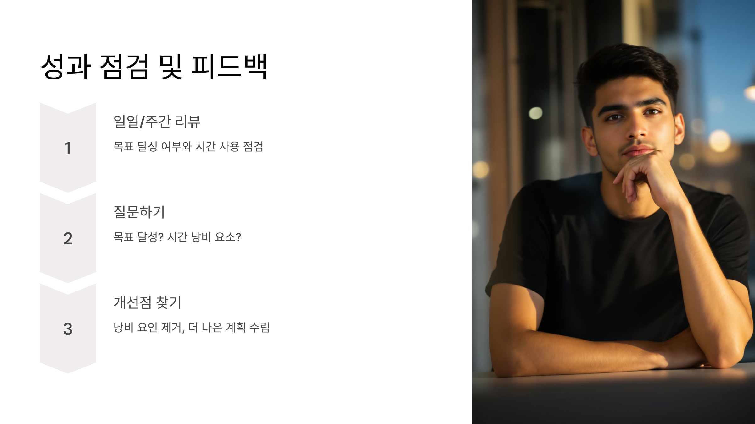 - 하루가 끝난 후 또는 주말에 목표 달성 여부와 시간을 어떻게 사용했는지 점검.
