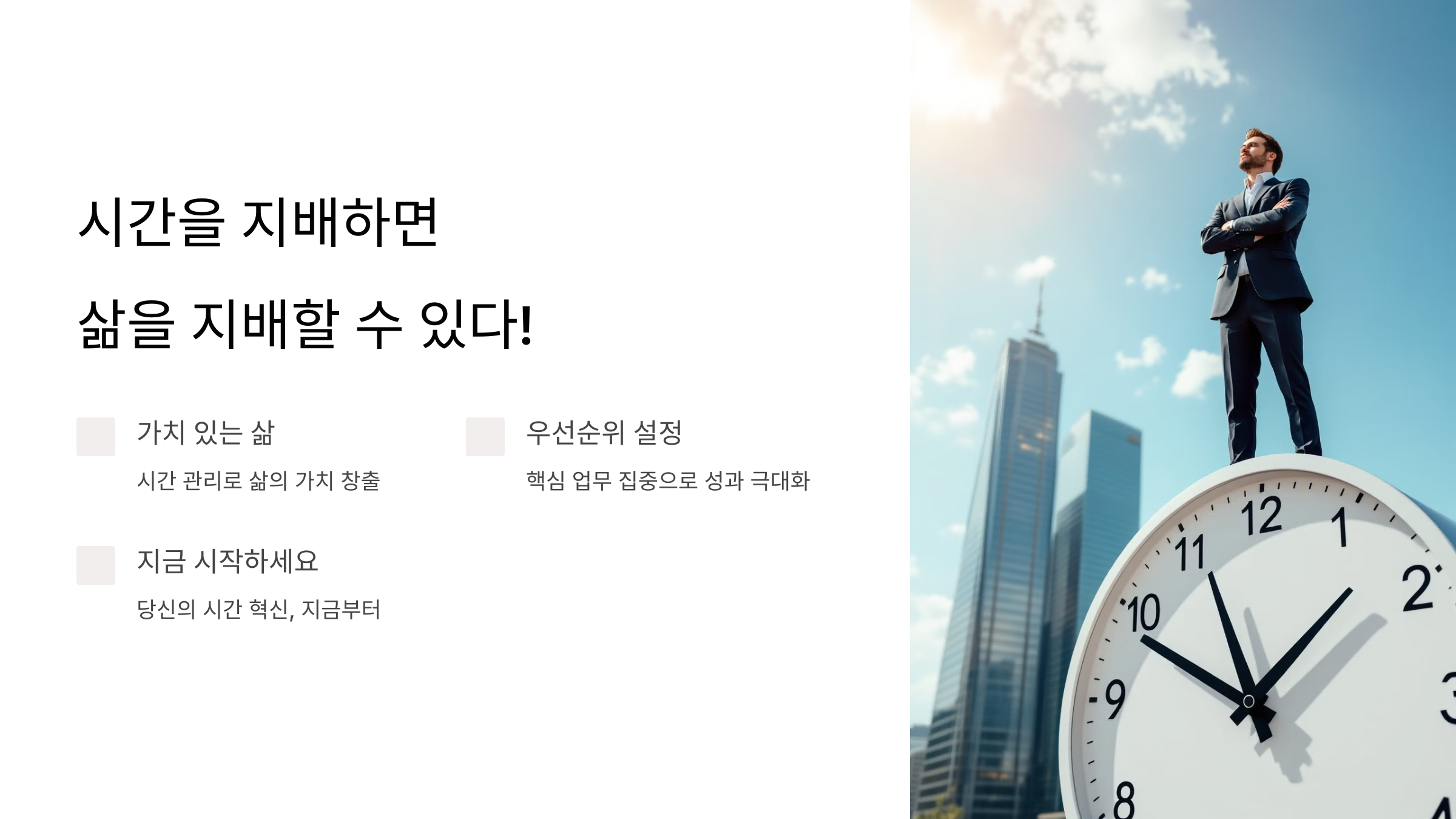 - 시간을 효율적으로 관리하면 같은 시간 안에 더 많은 일을 할 수 있습니다.