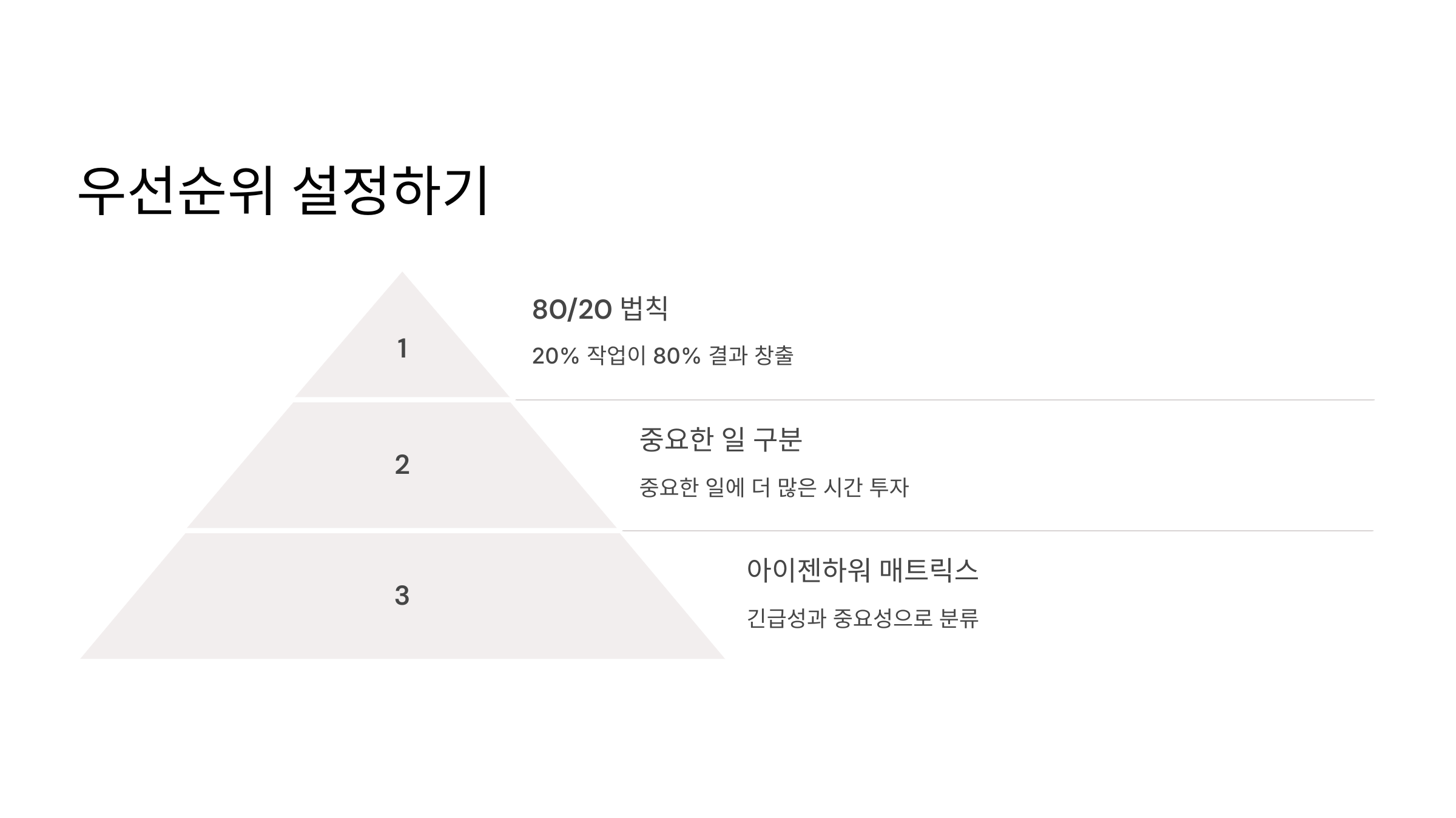 - 중요한 일과 급한 일을 구분하고, 중요한 일에 더 많은 시간을 투자하세요.