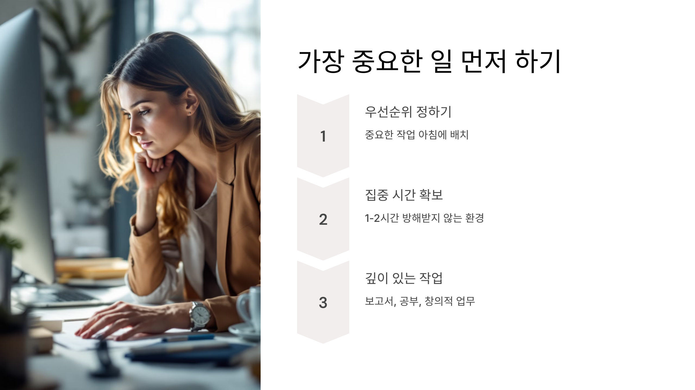 - 아침은 집중력이 가장 높은 시간대이므로, 중요한 일을 우선적으로 처리하세요.
