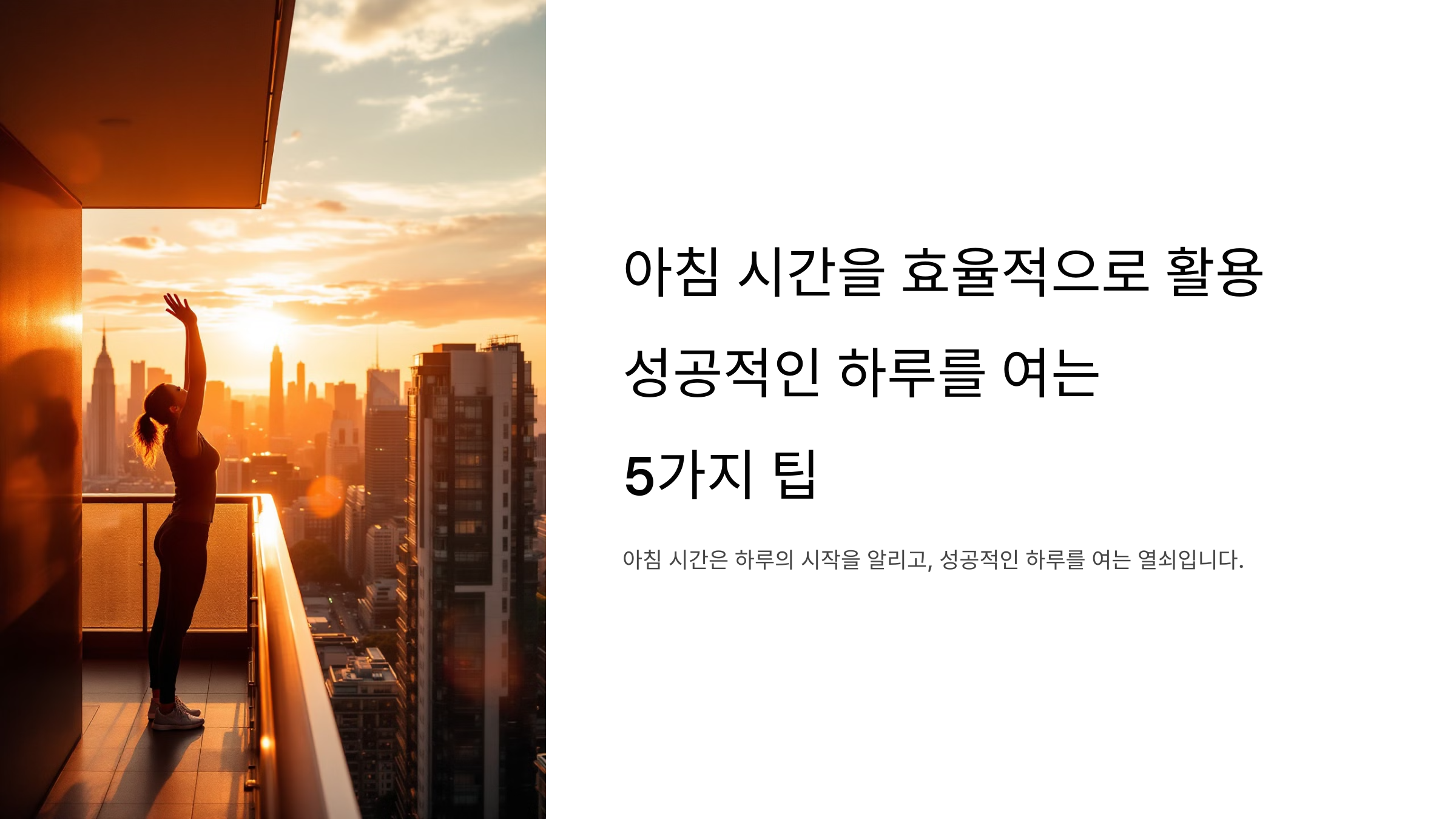아침 시간을 효율적으로 활용하면 하루의 흐름과 생산성을 극대화할 수 있습니다. 전날 밤 준비, 일관된 루틴, 중요한 일 우선 처리, 건강한 습관, 디지털 디톡스를 실천해 보세요. 작은 변화가 큰 성공으로 이어질 것입니다.