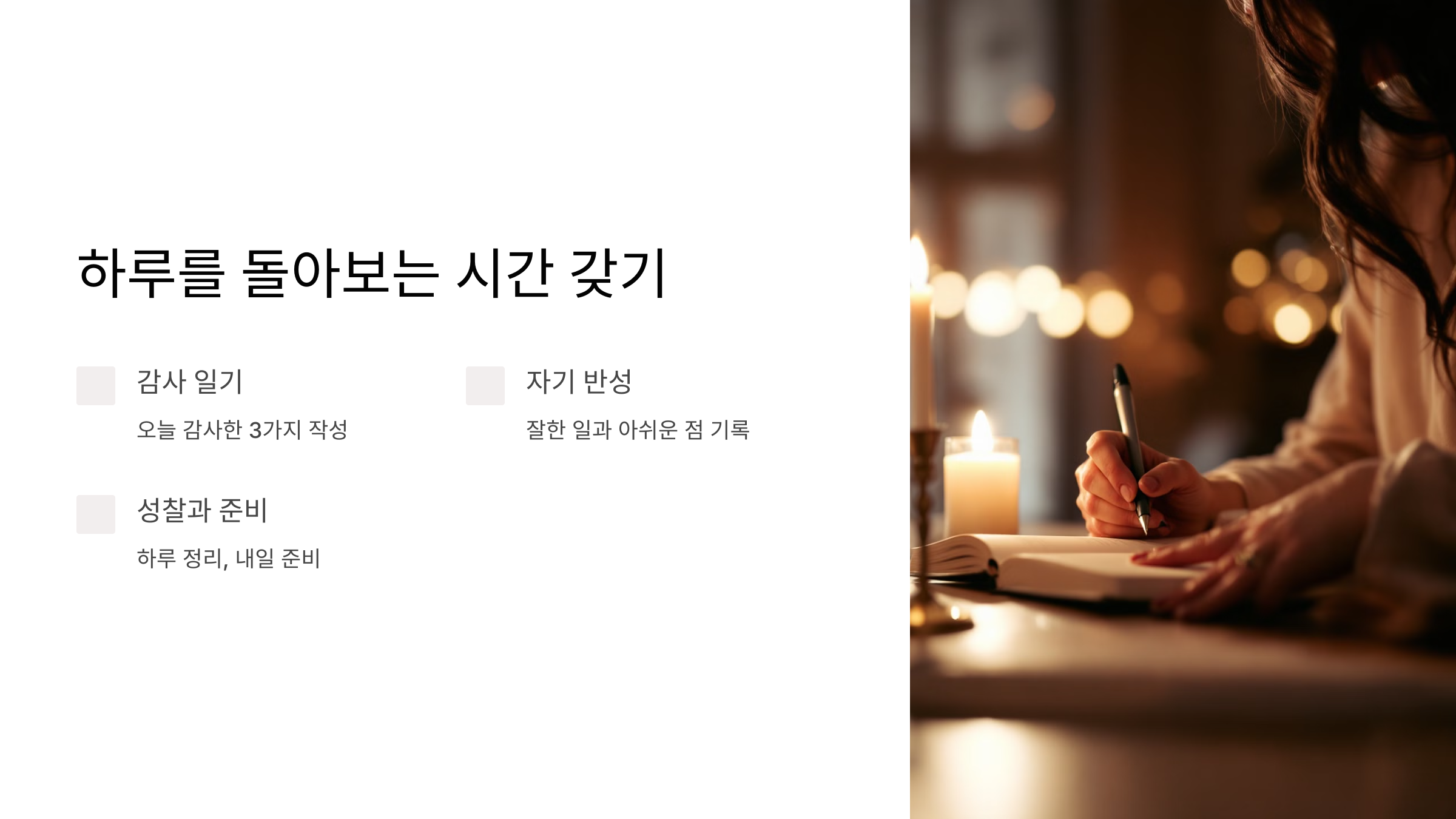 - 긍정적인 순간에 감사하며, 개선할 점을 찾아봅니다.