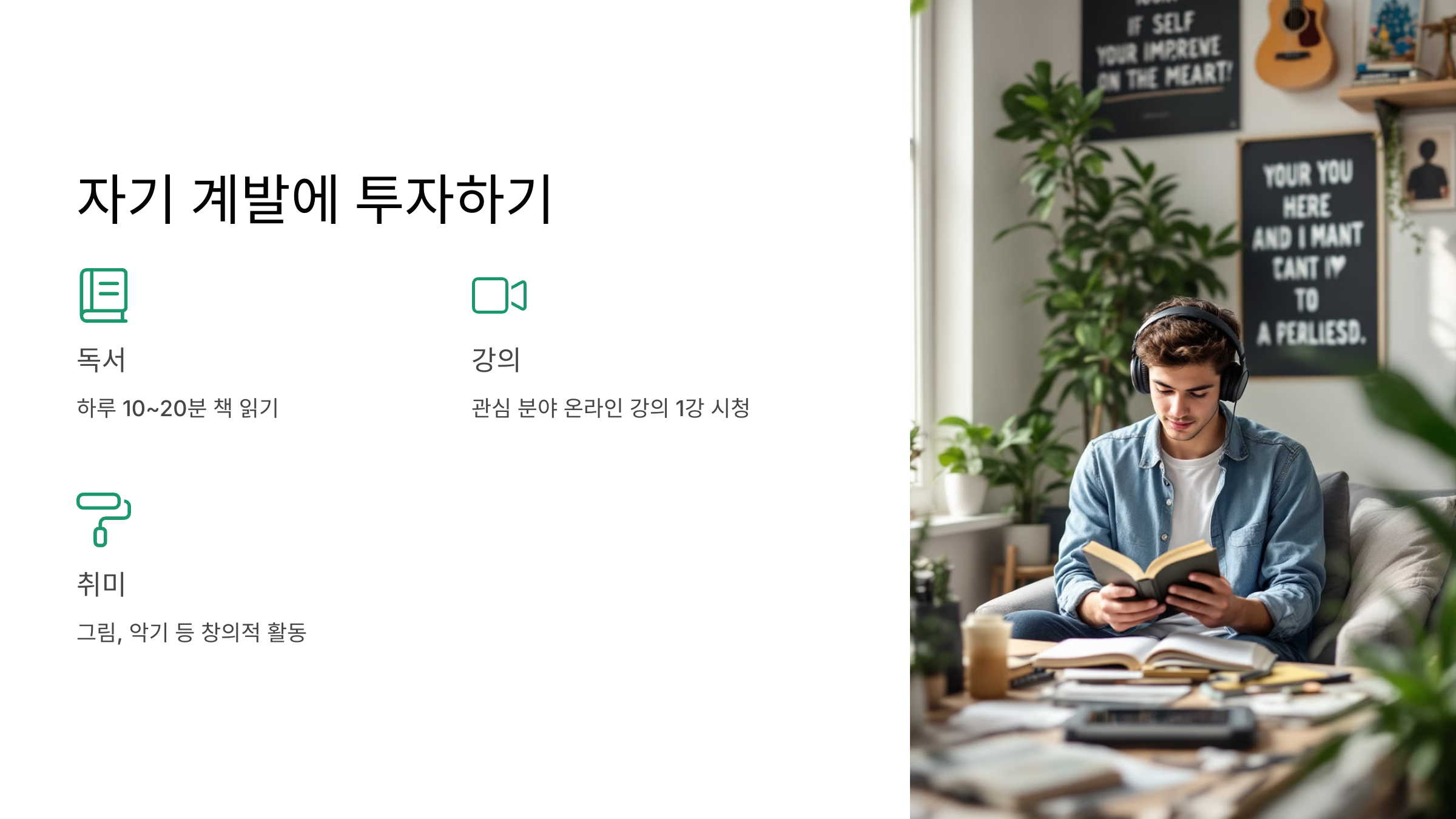 - 독서, 온라인 강의, 외국어 학습 등 자기 계발 활동에 시간을 투자하세요.
