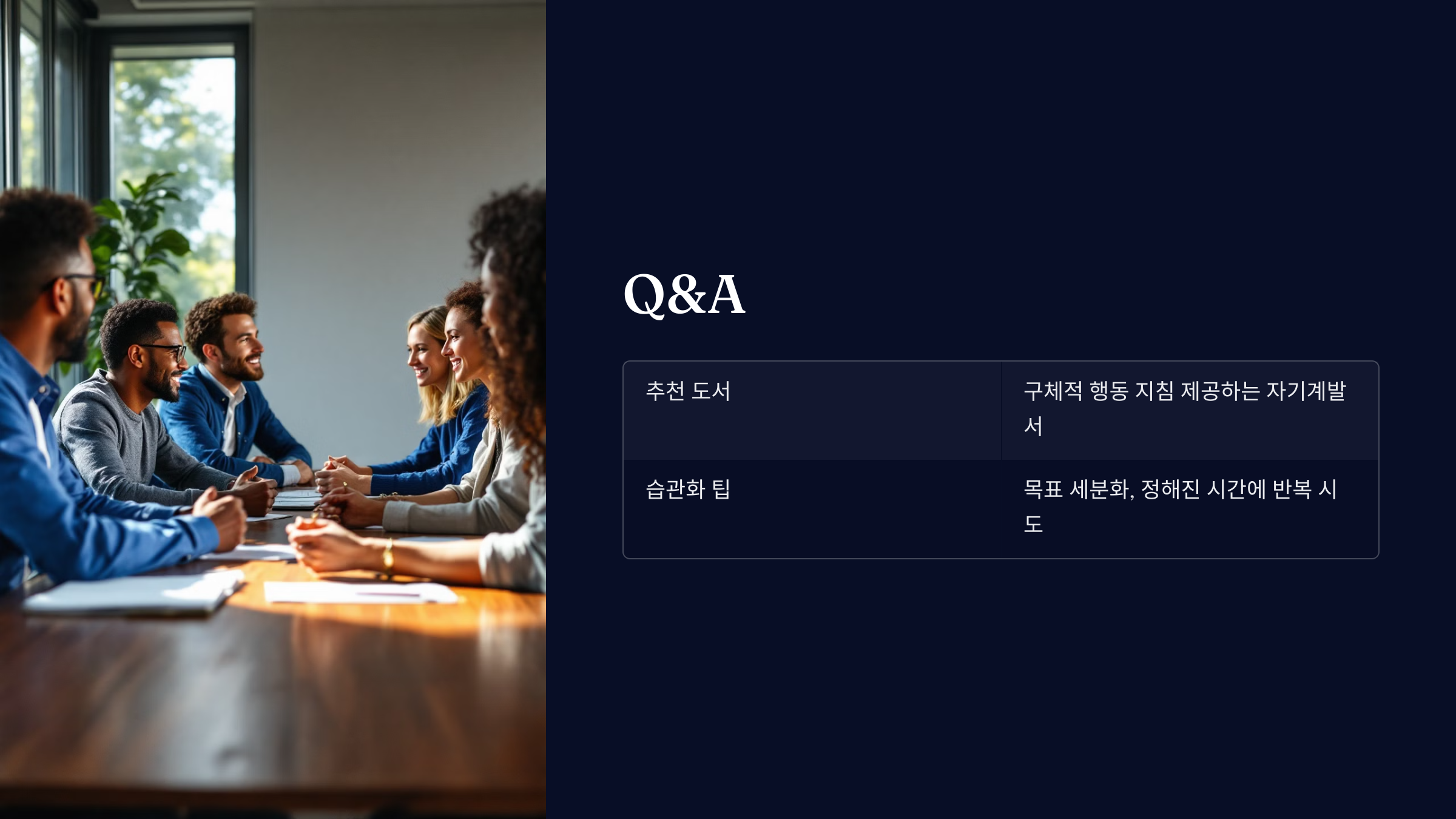 A1. 자기계발서를 추천합니다. "성공하는 사람들의 7가지 습관"이나 "원씽(The One Thing)"처럼 구체적인 행동 지침을 제공하는 책이 적합합니다.