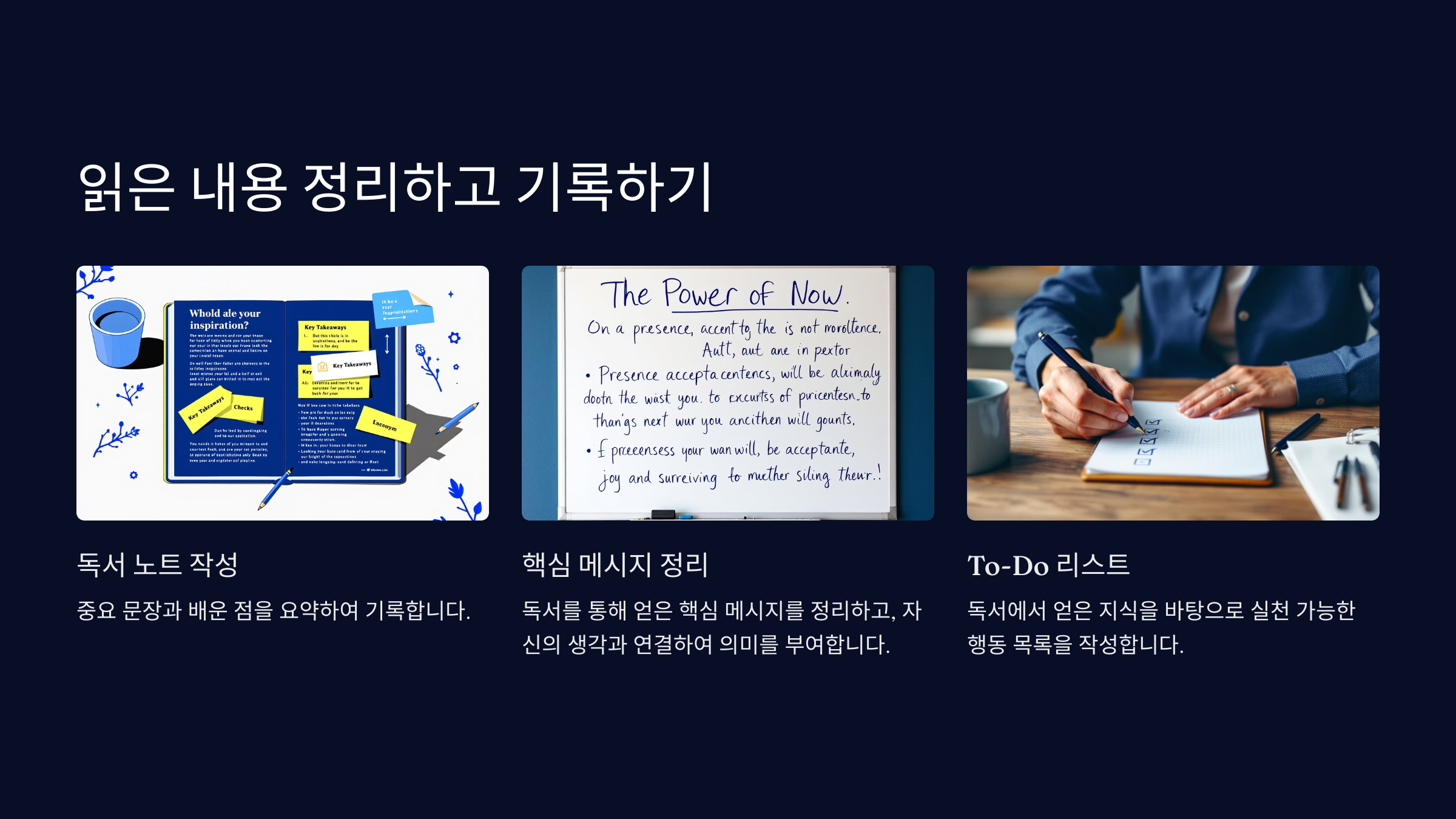 책에서 얻은 인사이트를 바탕으로 실천 가능한 행동 목록을 작성하세요. 예를 들어, 자기계발 책을 읽었다면 하루 10분 명상하기, 주간 목표 설정하기 같은 실천 가능한 행동을 정리합니다.
