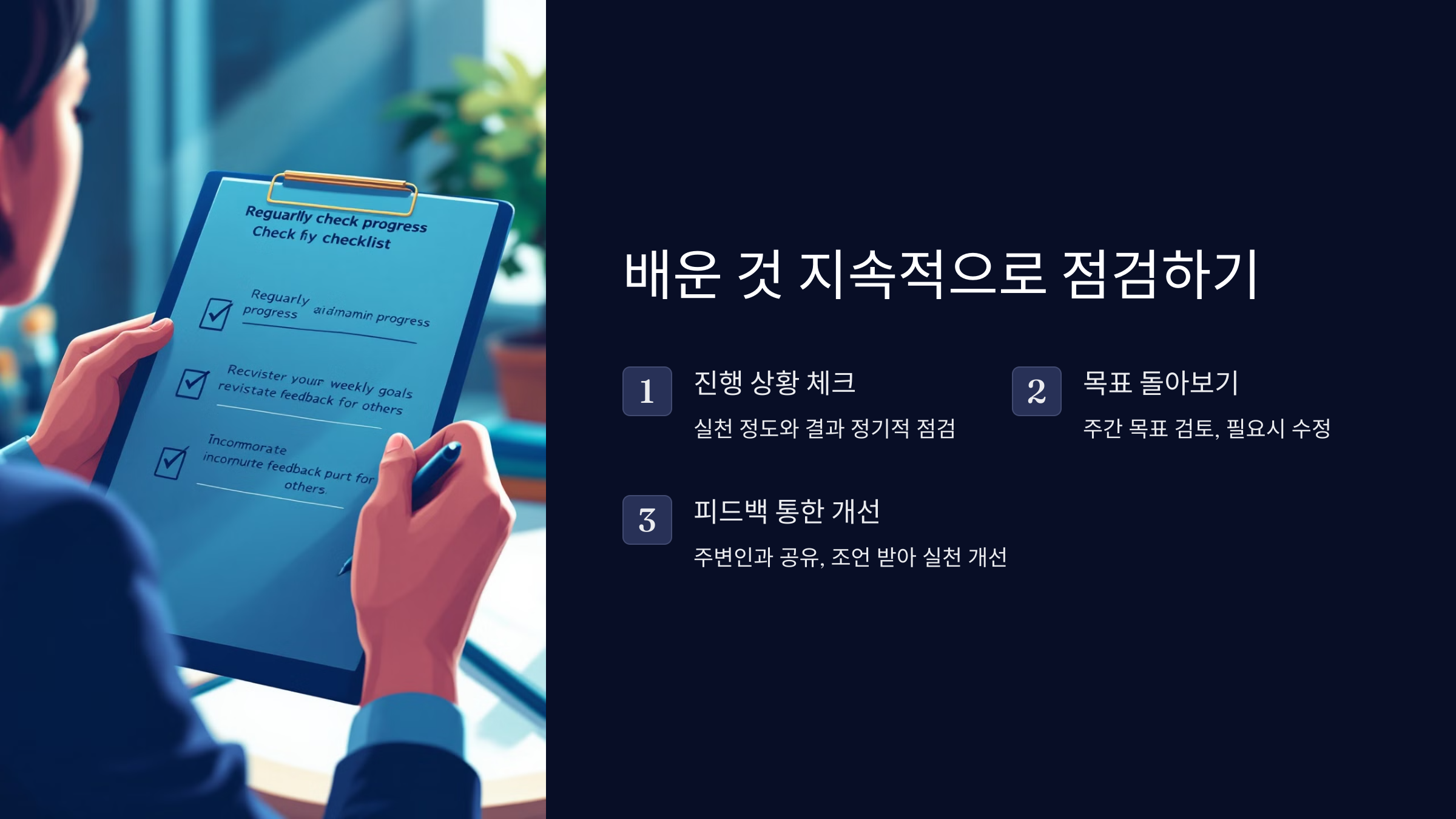 책에서 배운 것을 얼마나 실천했는지, 어떤 결과를 얻었는지 정기적으로 점검하세요. 일주일에 한 번 목표를 돌아보며, 필요한 부분은 수정하거나 보완할 수 있습니다. - 피드백을 통한 개선