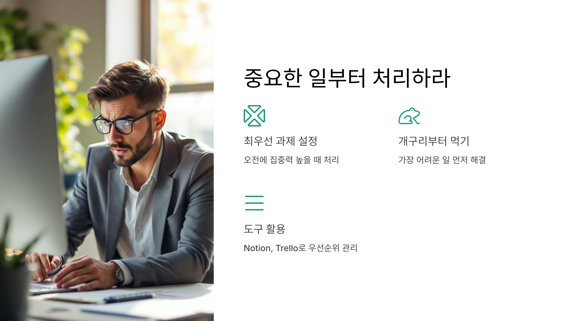 - "개구리부터 먹어라" 원칙: 가장 어려운 일을 먼저 해결.