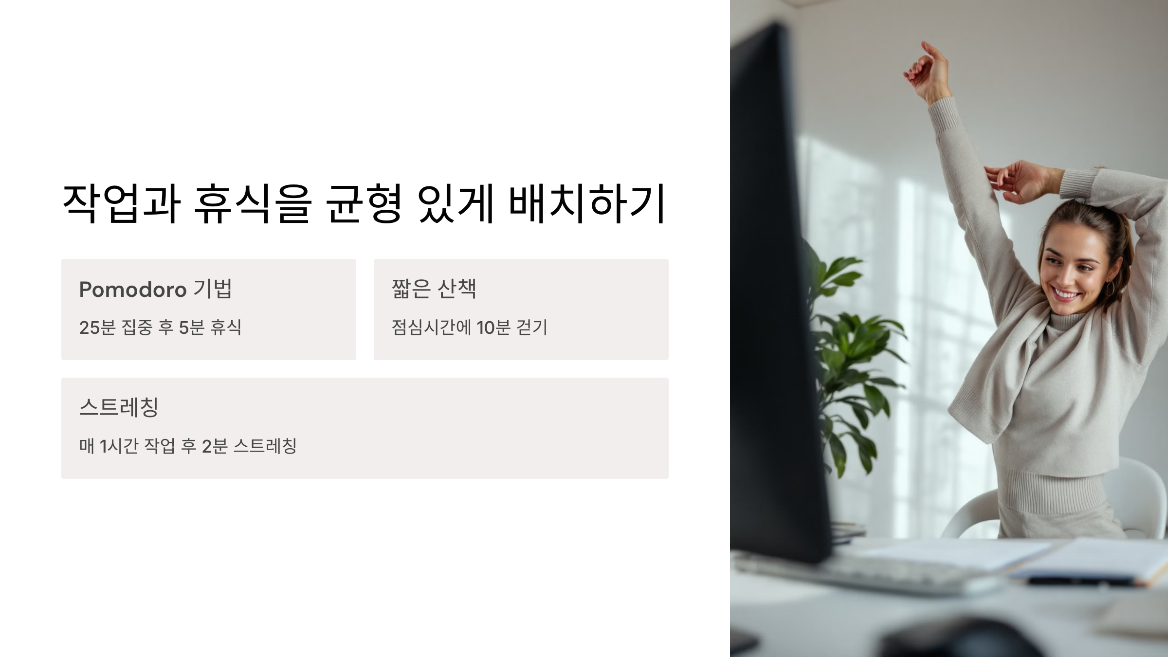 효율적인 루틴에는 집중 시간과 휴식 시간이 조화를 이루어야 합니다.