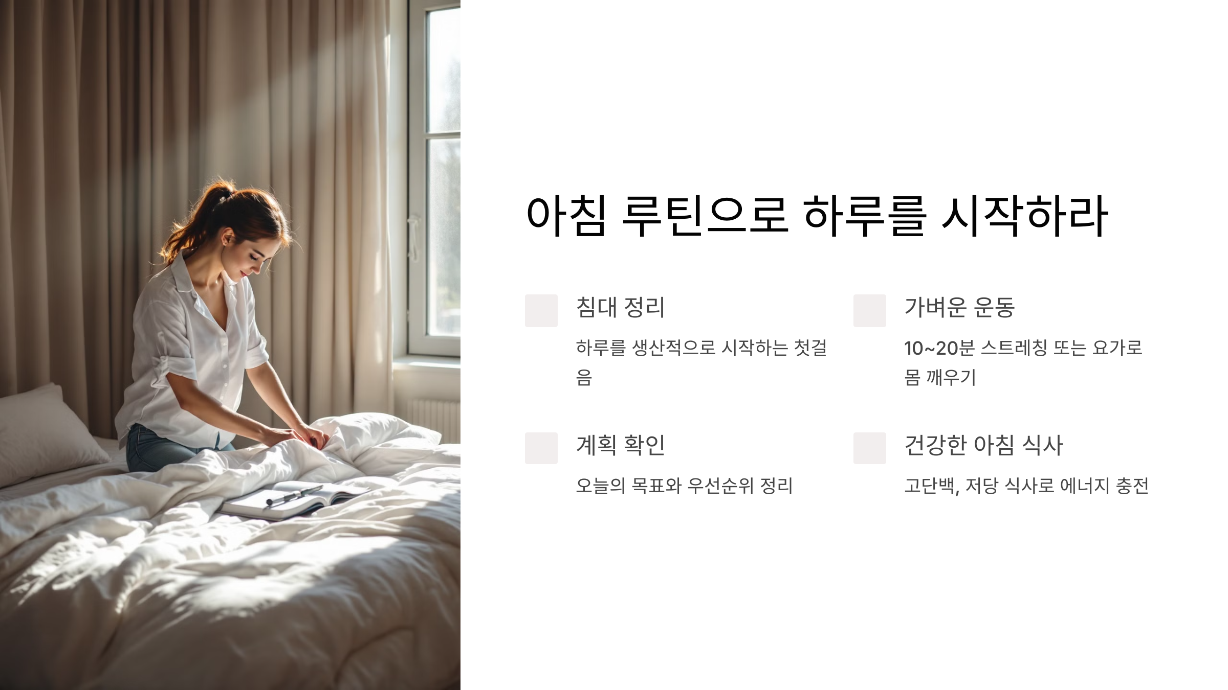 - 운동: 10~20분의 가벼운 스트레칭 또는 요가로 몸을 깨우세요.