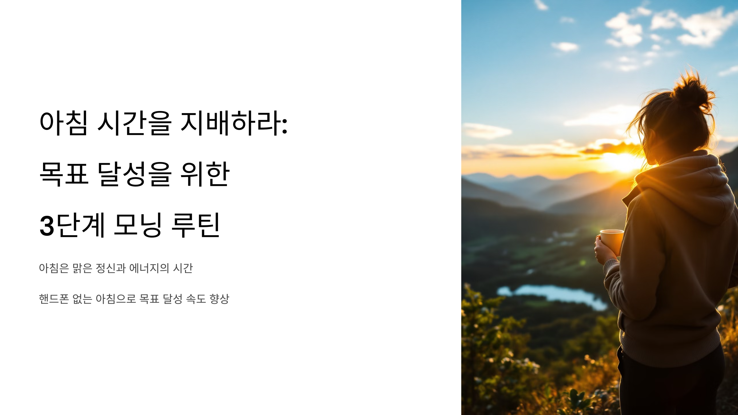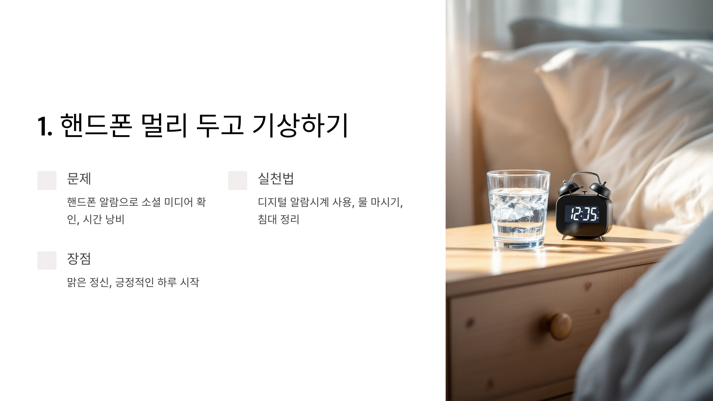 핸드폰을 멀리하는 작은 변화가 하루를, 나아가 인생을 바꿀 수 있습니다. 3단계로 구성된 간단한 모닝 루틴을 실천해보세요. 더 맑은 정신과 생산적인 하루를 위한 첫걸음을 지금 시작하세요!