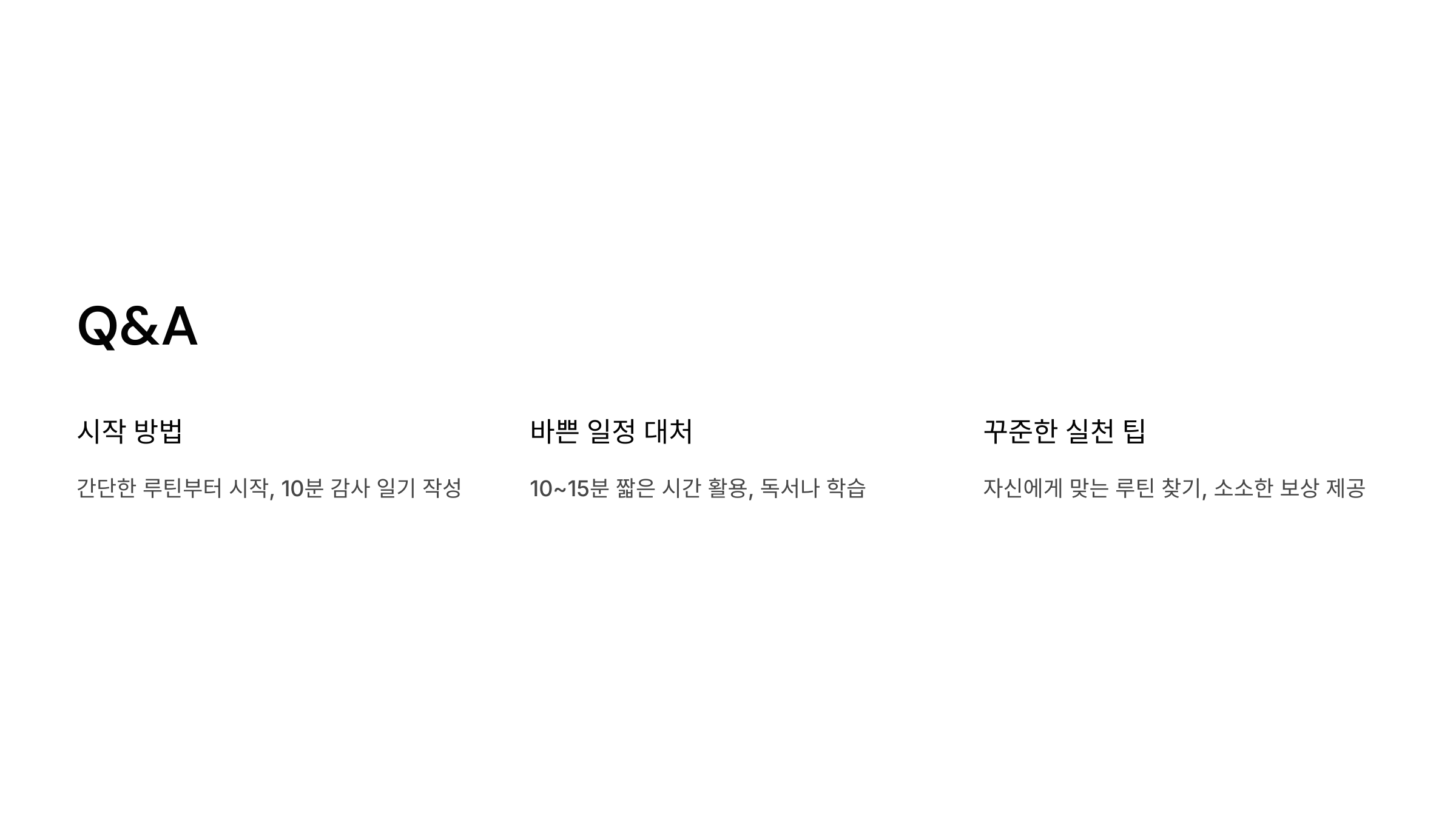 A1. 간단한 루틴부터 시작하세요. 예: "하루 10분 감사 일기 작성"처럼 작은 실천으로 꾸준함을 유지하세요.