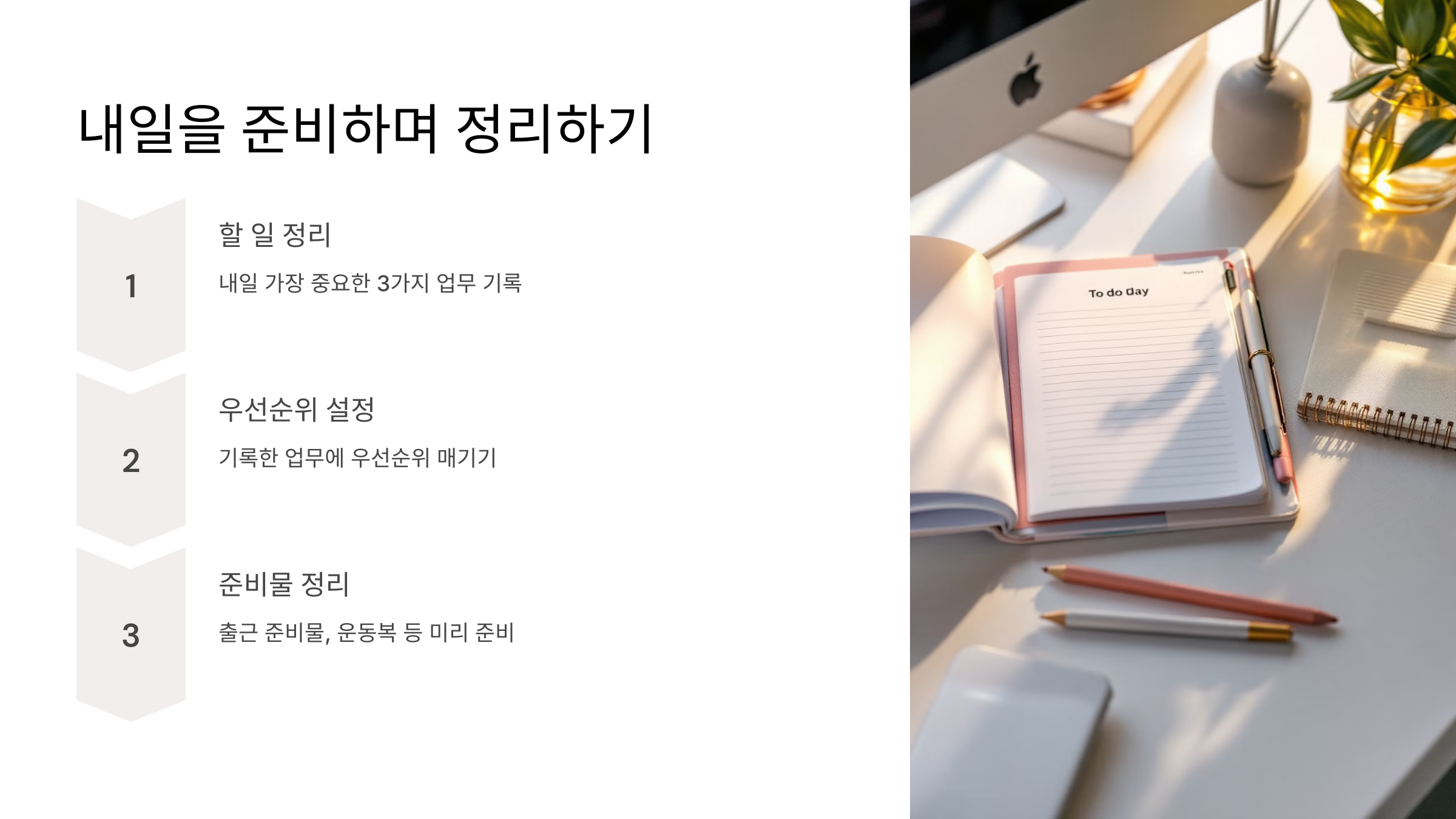 - 플래너나 To-Do 리스트에 내일의 할 일을 미리 정리하세요.
