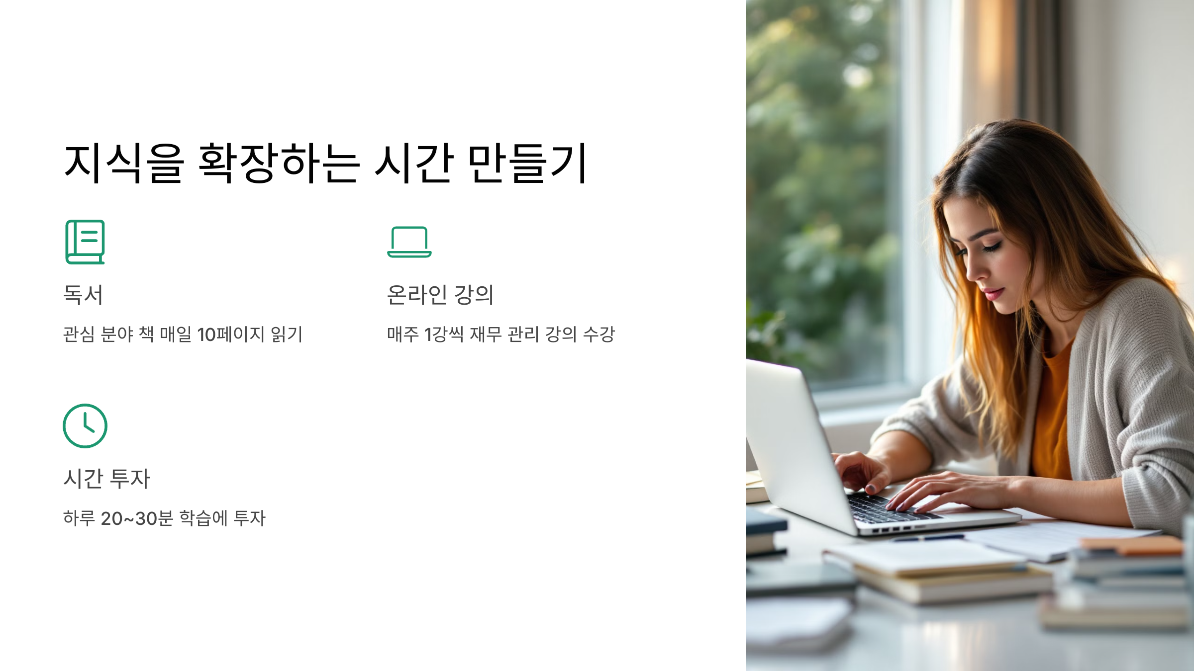 - 책을 읽거나, 온라인 강의를 수강하며 하루 20~30분을 학습에 투자하세요.