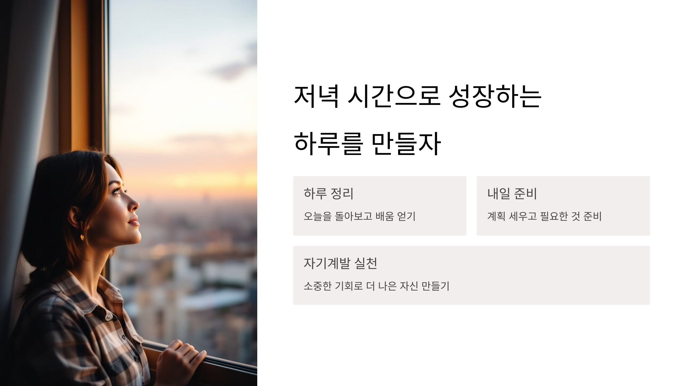저녁 시간은 단순한 휴식 시간이 아니라, 하루를 정리하고 내일을 준비하며 자기계발을 실천할 수 있는 소중한 기회입니다. 오늘 소개한 3가지 방법을 실천해 하루 끝에 더 나은 자신을 만나보세요.