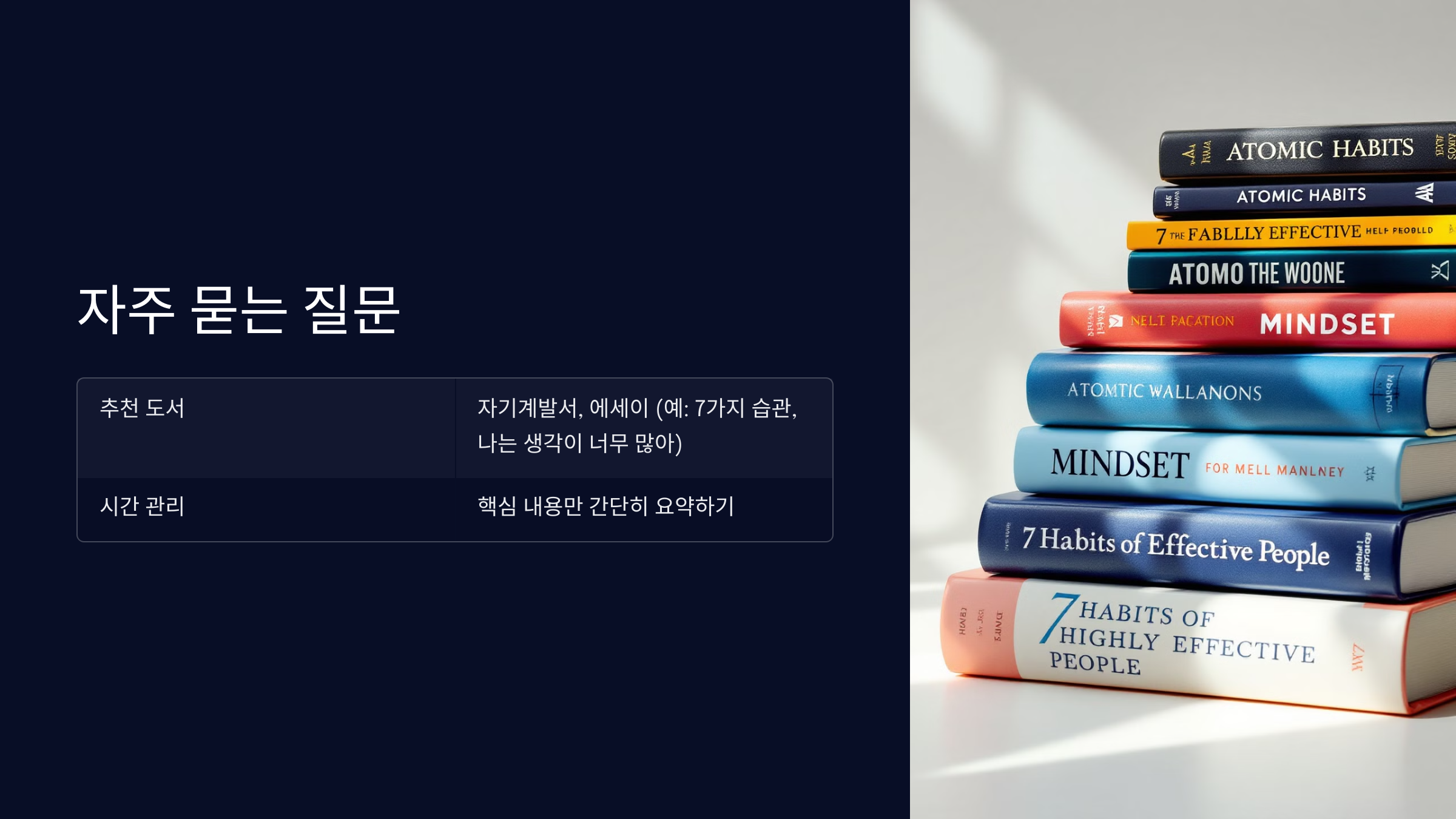 A1. 자기계발서나 에세이가 좋습니다. "성공하는 사람들의 7가지 습관"이나 "나는 생각이 너무 많아" 같은 책은 구체적인 내용을 다루고 있어 감상문 쓰기에 적합합니다.