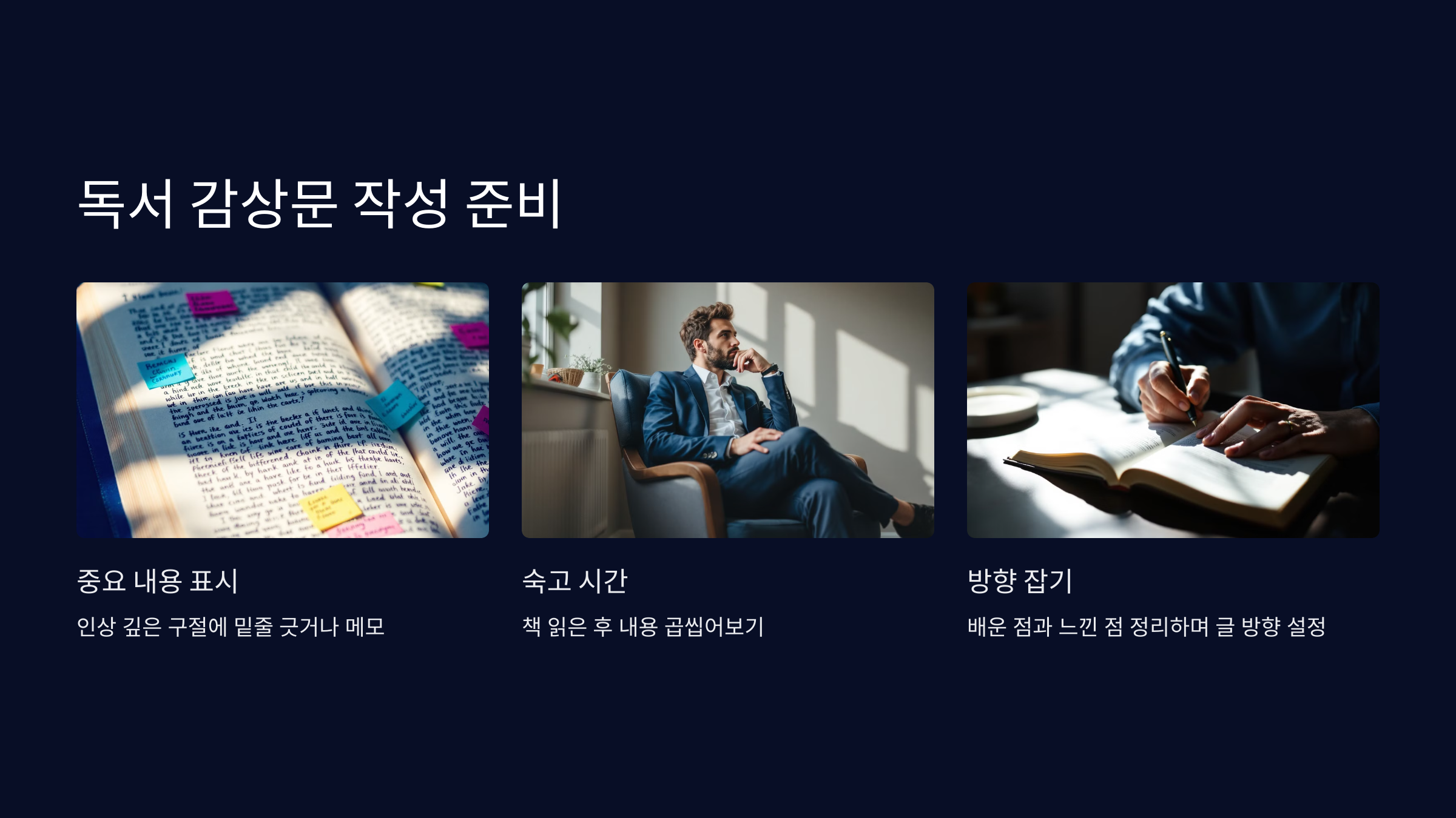 책을 읽는 동안 중요한 문장이나 인상 깊은 구절에 밑줄을 긋거나 메모를 남겨보세요. 이는 나중에 감상문을 쓸 때 생각을 정리하는 데 큰 도움이 됩니다. - 읽은 후 잠시 숙고하기