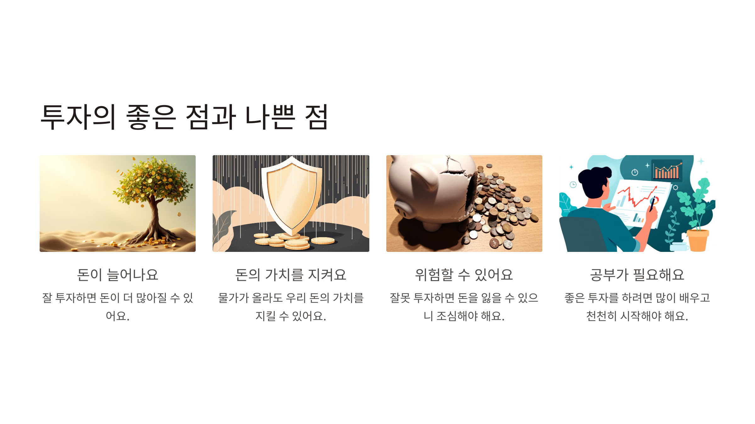 - 투자는 시간이 지날수록 효과가 커지기 때문에, 어릴 때부터 시작하는 것이 좋습니다.