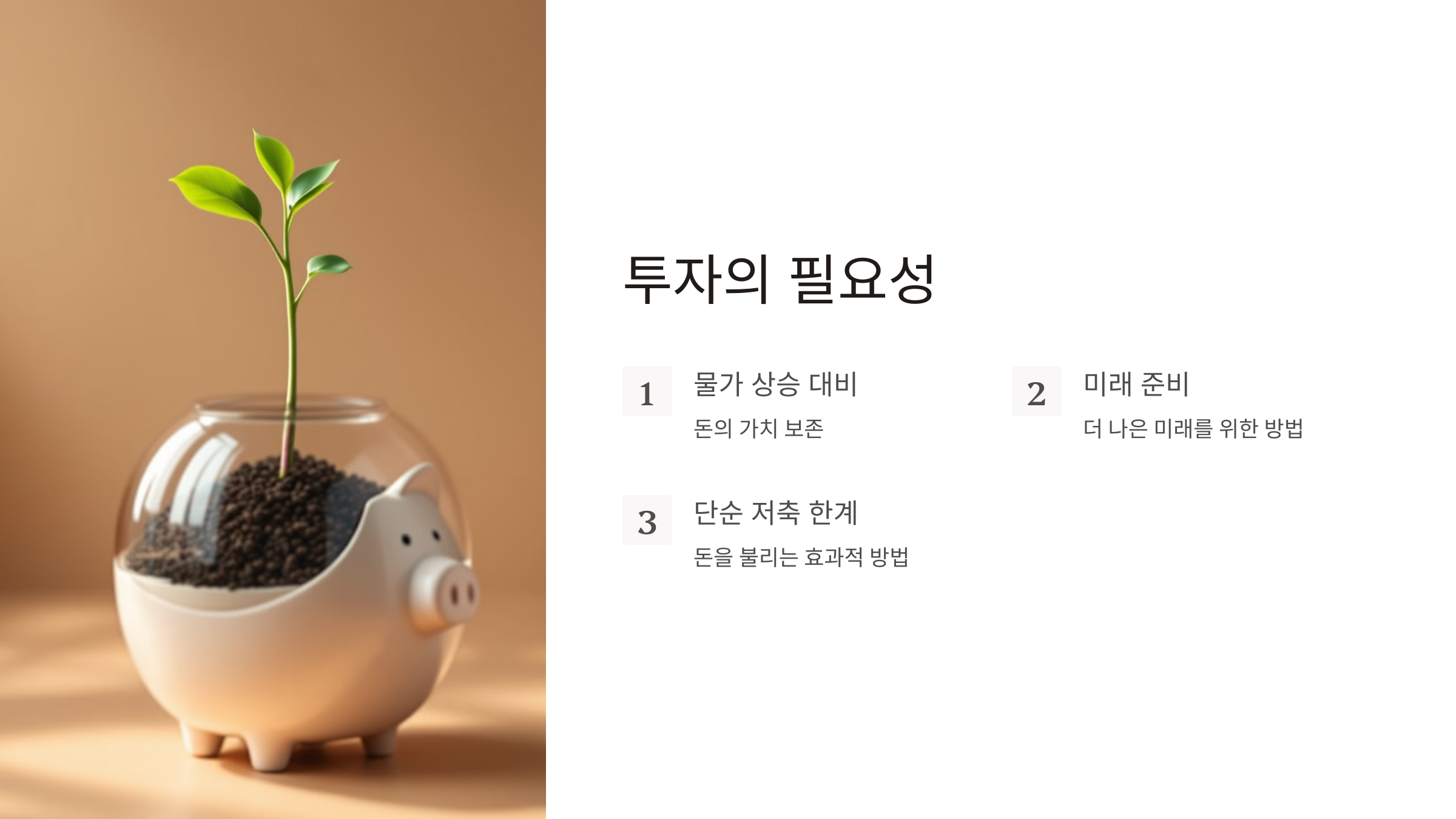 돈을 단순히 모으기만 하는 것보다 투자를 통해 불려 나가는 것이 중요합니다. 시간이 지나면서 물가가 오르기 때문에, 그냥 돈을 가지고만 있으면 가치가 줄어들 수 있습니다. 따라서 투자는 단순히 돈을 버는 것이 아니라, 더 나은 미래를 준비하는 방법입니다.