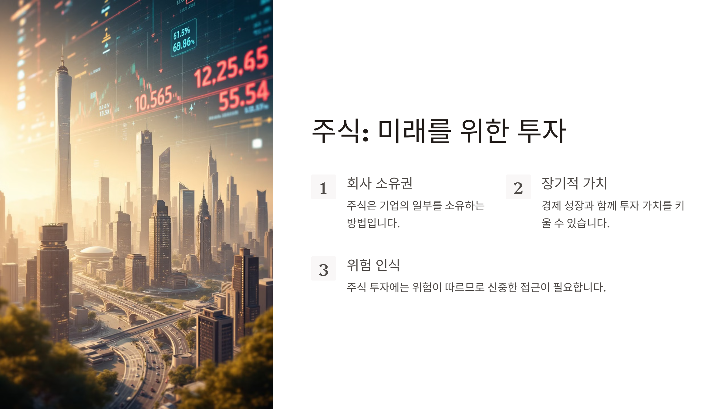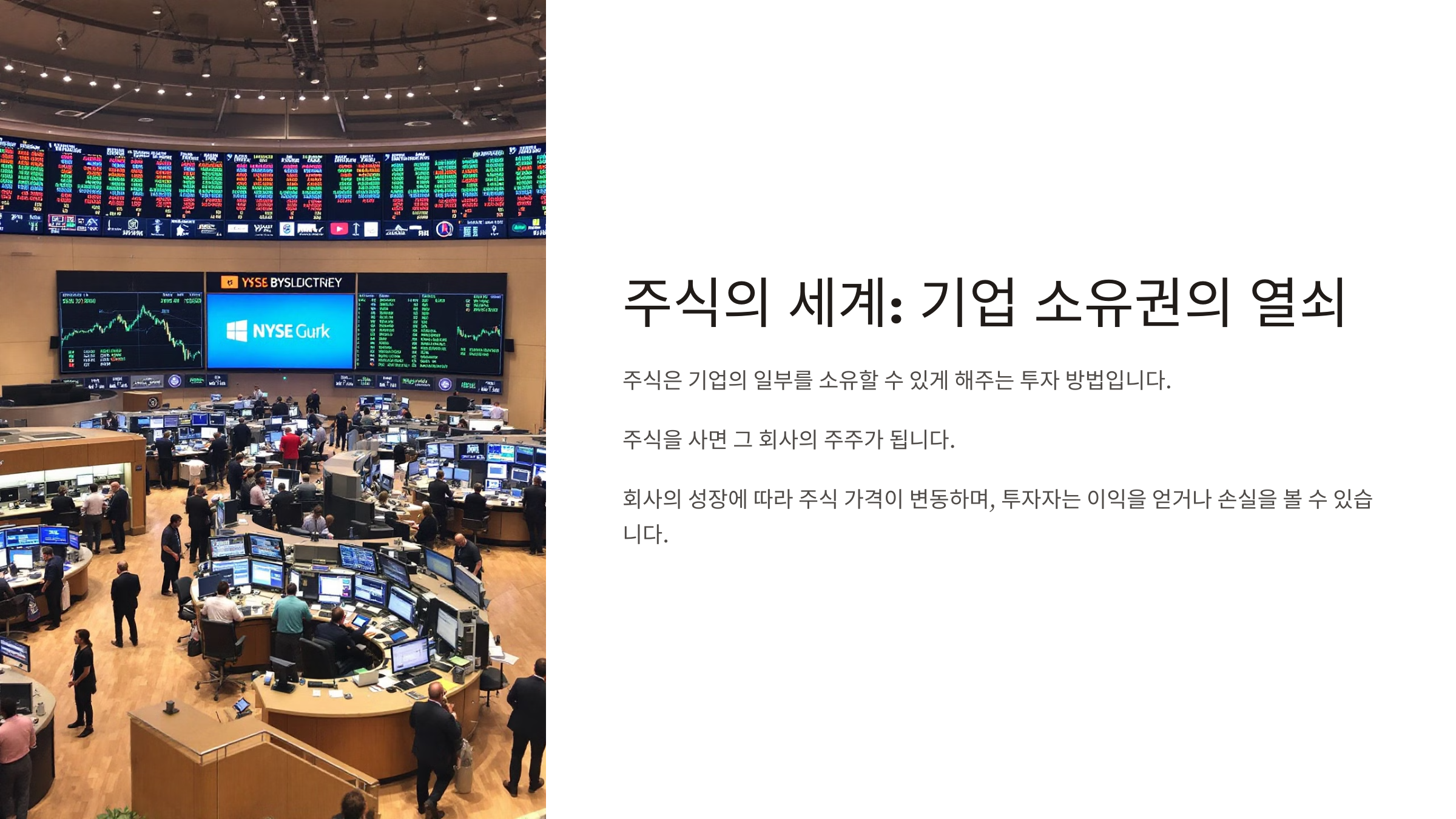 주식은 회사를 소유하는 한 가지 방법이며, 장기적으로 보면 경제 성장과 함께 가치를 키울 수 있는 투자입니다. 하지만 위험도 존재하므로 신중하게 투자해야 합니다.