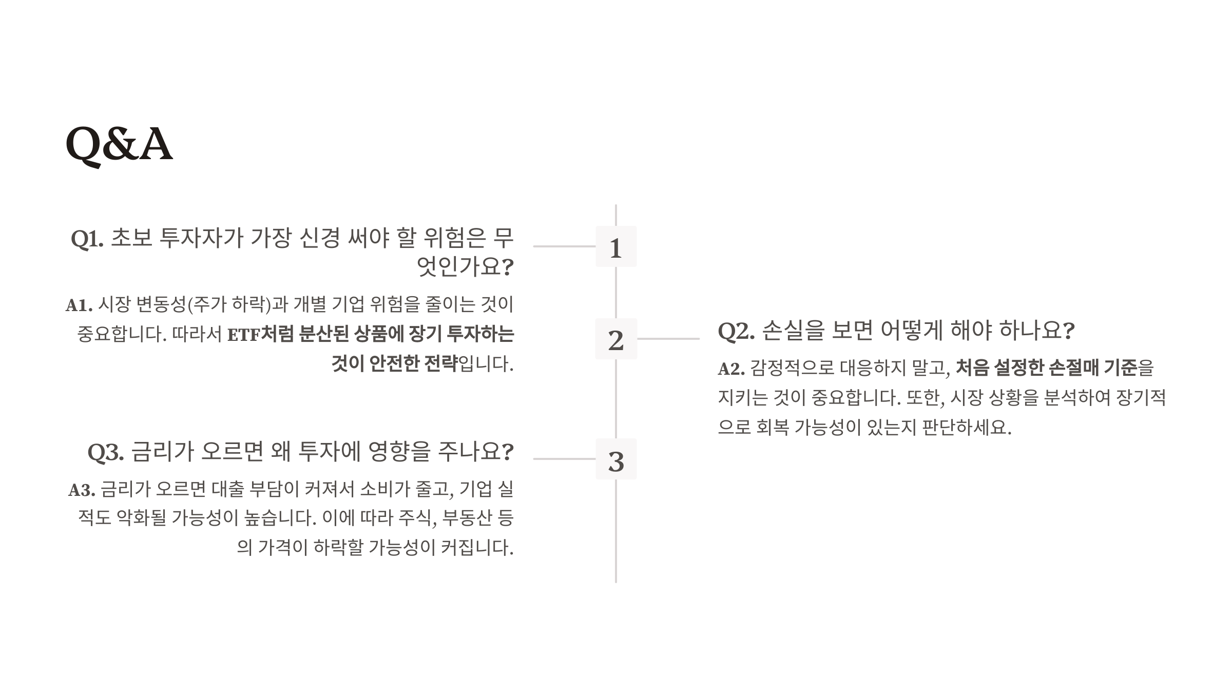 A1. 시장 변동성(주가 하락)과 개별 기업 위험을 줄이는 것이 중요합니다. 따라서 ETF처럼 분산된 상품에 장기 투자하는 것이 안전한 전략입니다.