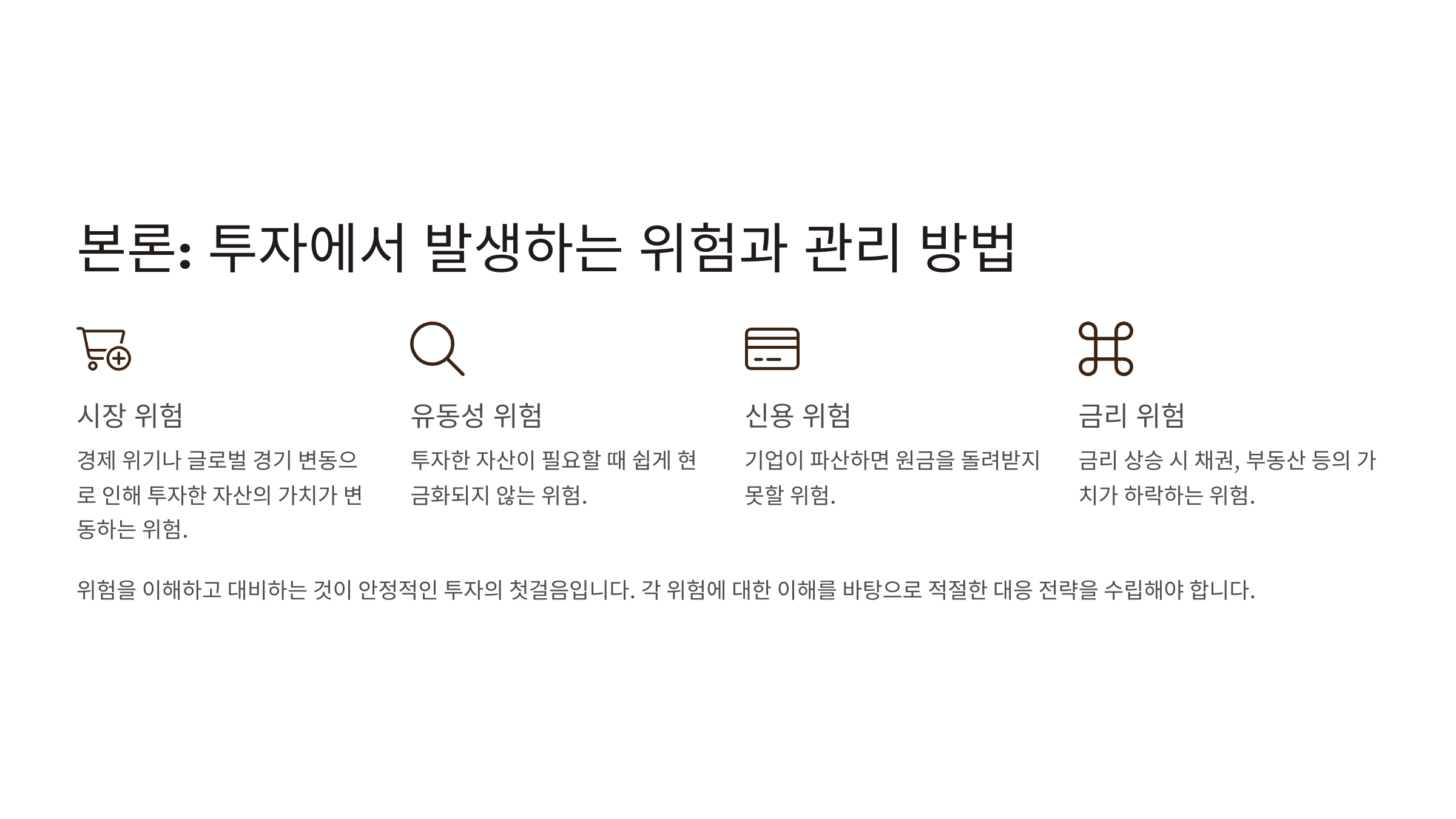 그렇다면 투자에서 발생하는 위험에는 어떤 것들이 있으며, 이를 어떻게 관리할 수 있을까요?