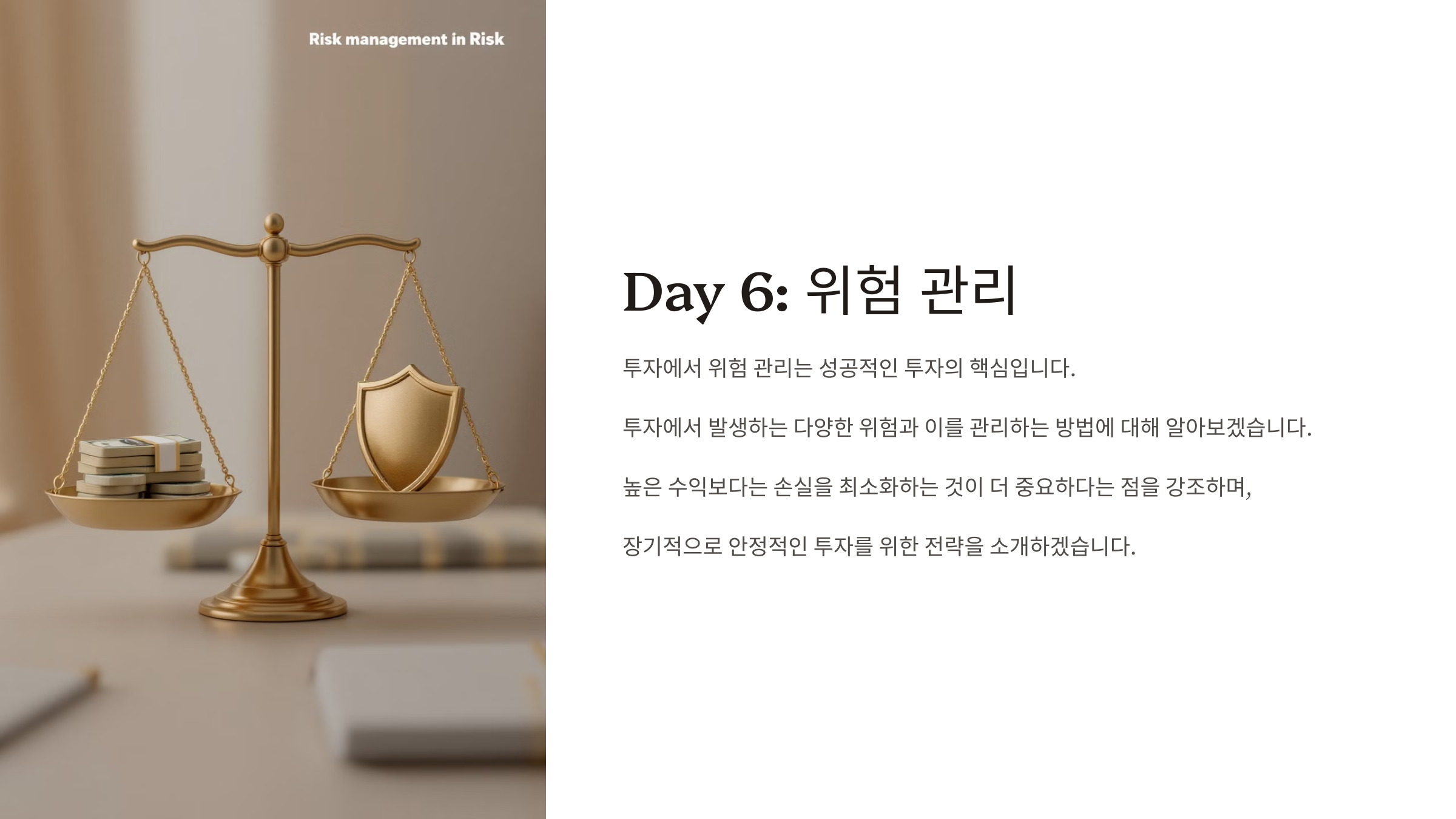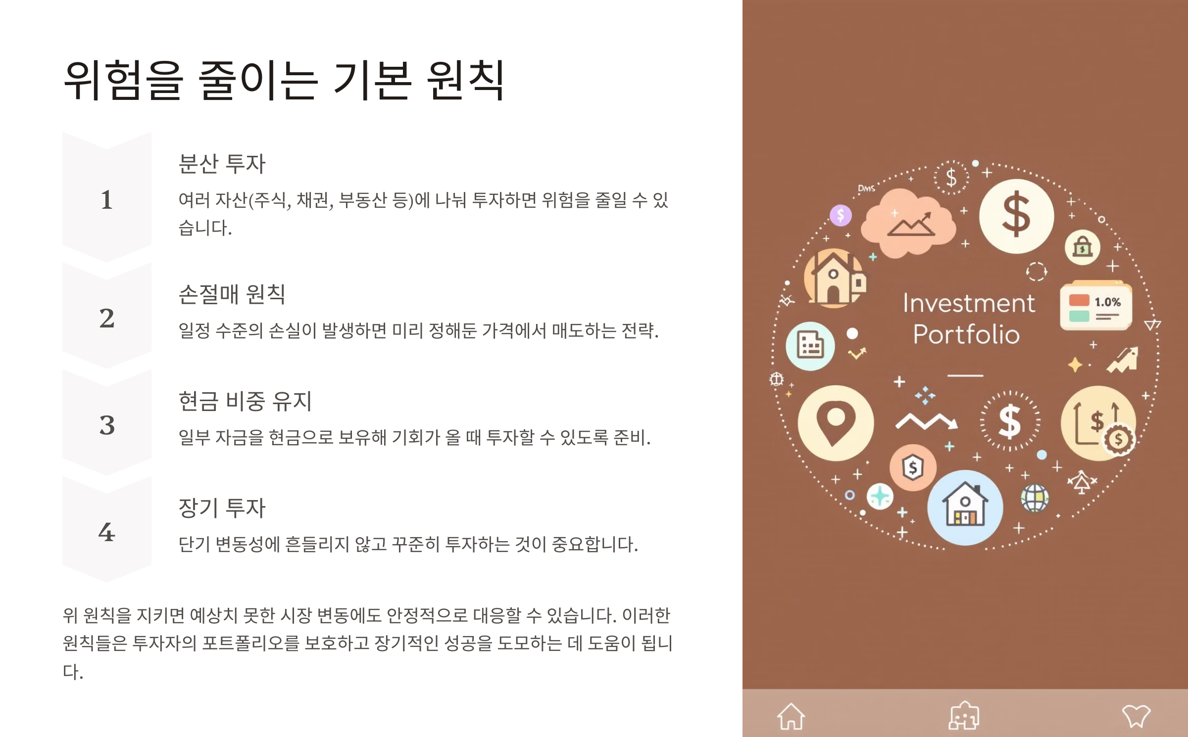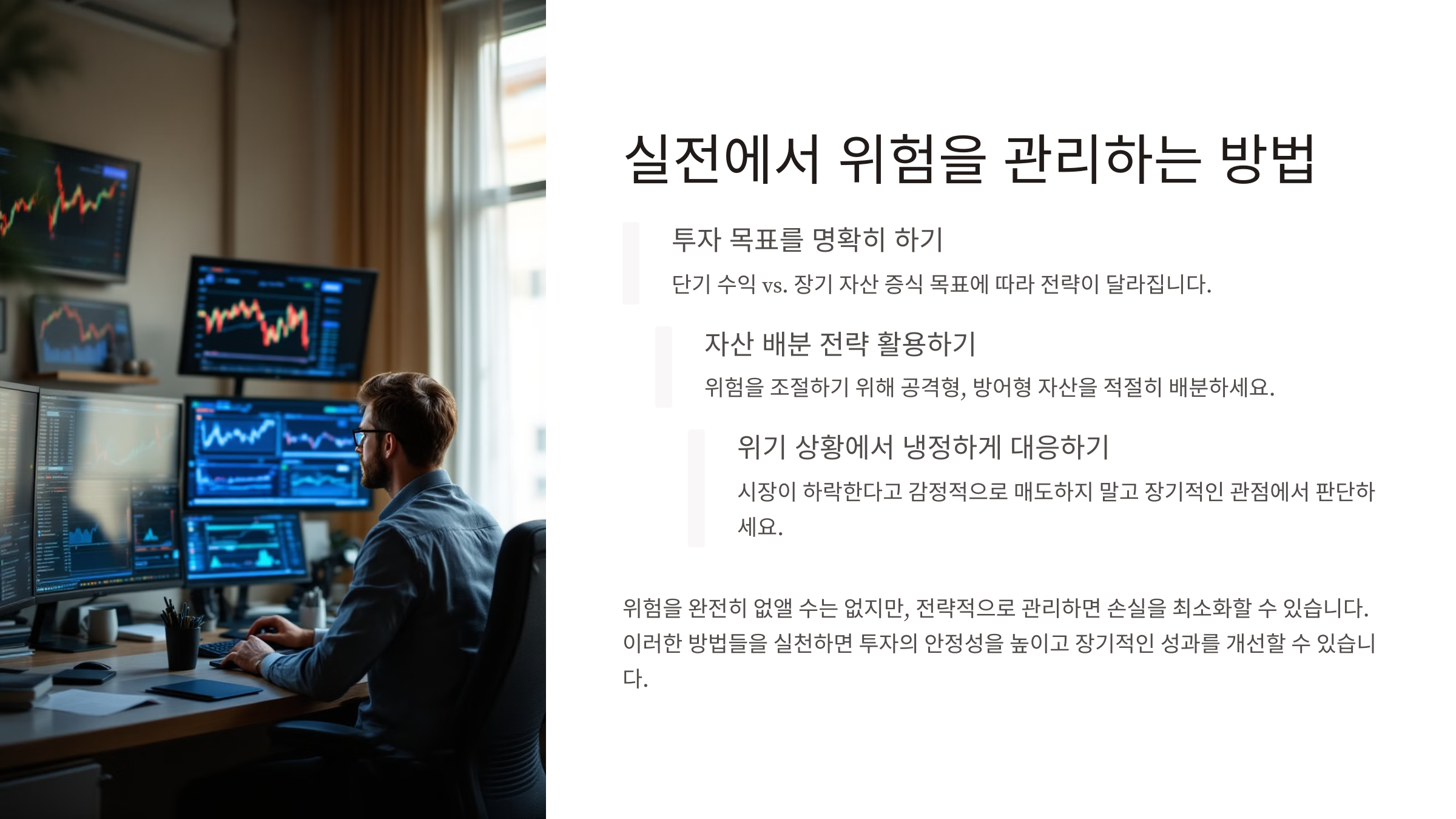 - 위험을 줄이는 방법을 알면 장기적으로 안정적인 투자가 가능합니다.